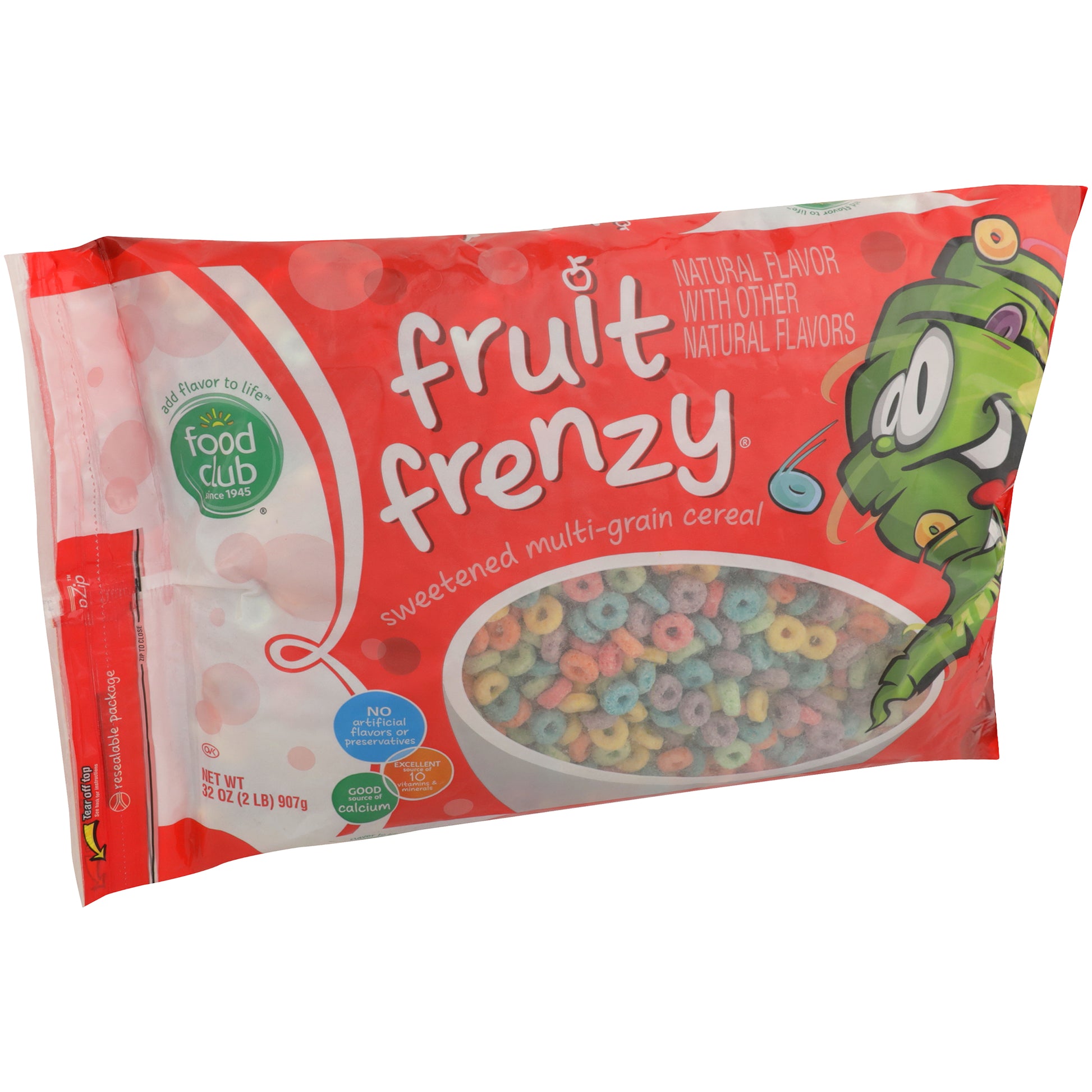 MATCH YOUR WHIRLWIND MORNING WITH THE BIG, FRUITY TASTE OF FOOD CLUB FRUIT FRENZY. IT'S A COLORFUL, CRUNCHY TWISTER OF TASTE THAT'LL HAVE YOU CIRCLING BACK FOR MORE!