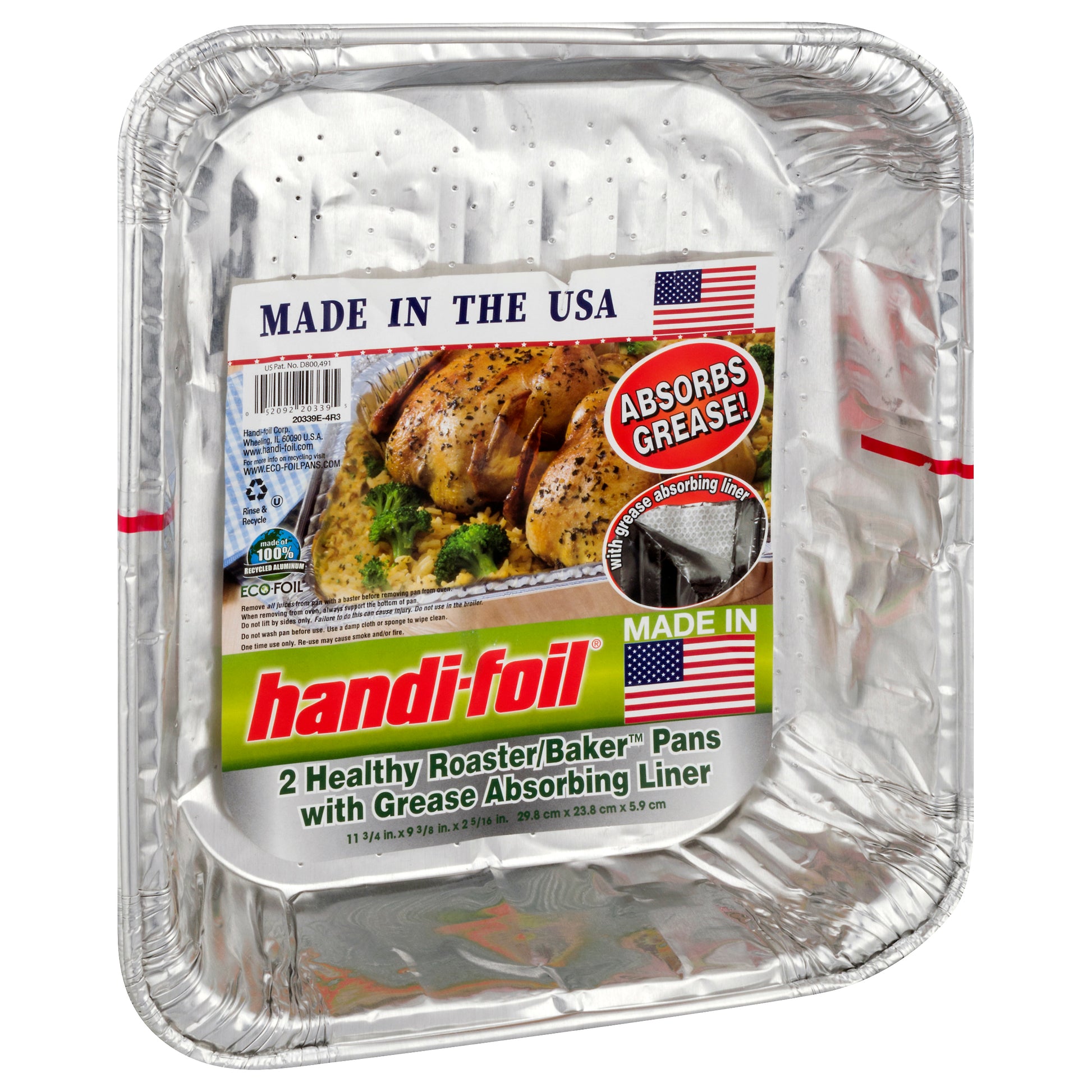 11-3/4 inches x 9-3/8 inches x 2-5/16 inches. 29.8 cm x 23.8 cm x 5.9 cm. With grease absorbing liner. Absorbs grease! www.handi-foil.com. www.eco-foilpans.com. For more info on recyling visit www.eco-foilpans.com. Made of 100% recycled aluminum. Rinse & recycle. Made in the USA.